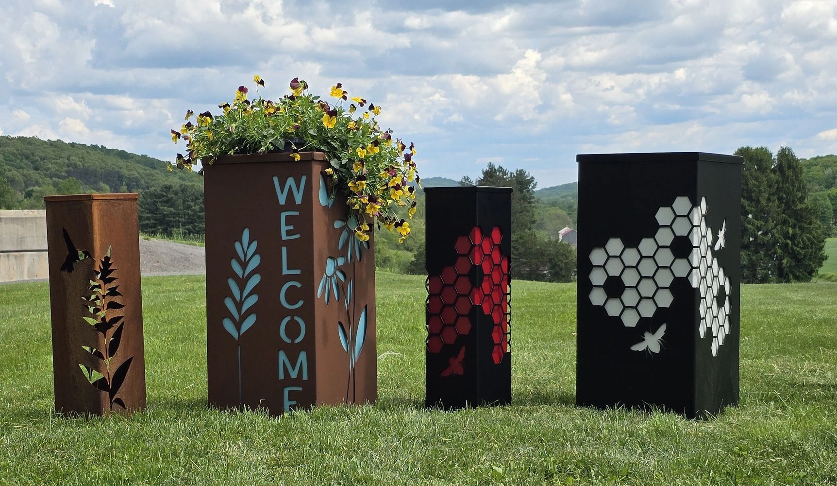 All etched glass items are sand blasted to create a nice deep etch into the glass. All metal art is designed, cut, power coated and if needed, welded in our shop in Elliottsburg, PA.